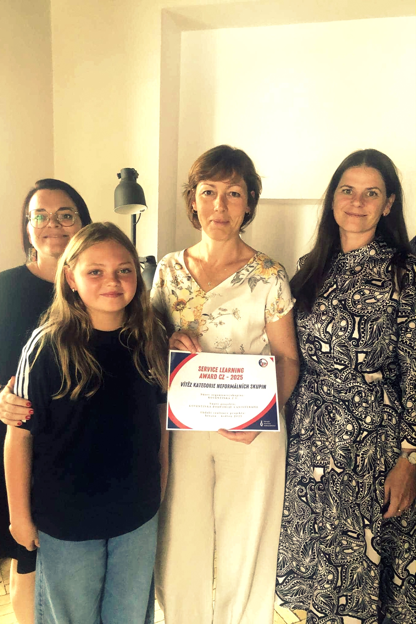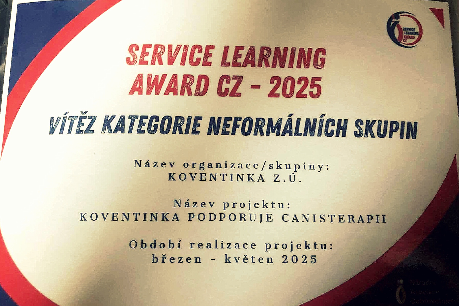 Projekt Koventinka podporuje canisterapii, realizovaný metodou Service Learning – tedy učením skrze službu druhým – přinesl dětem nejen zkušenost s pomocí, ale i hluboký prožitek sounáležitosti a radosti z činů, které mají smysl. A právě tato upřímná chuť dělat svět lepším přinesla i krásné uznání: získali jsme 1. místo v Service Learning Award CZ 2025 v kategorii Neformální skupiny a postoupili do mezinárodního kola.